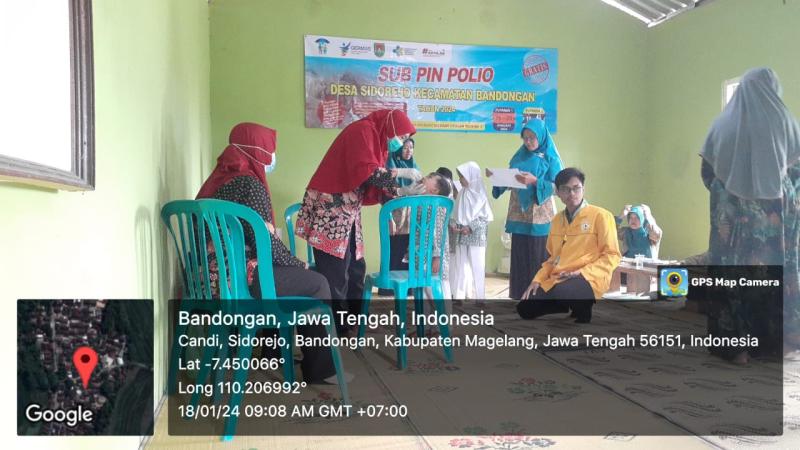 Memastikan pemberian vaksin polio lancar, kegiatan ini ditinjau oleh tim dari Puskesmas Bandongan yang bertugas untuk mengawasi jalannya Sub PIN Polio di seluruh desa dalam Kecamatan Bandongan. Kepala Desa kemudian melakukan peninjauan langsung ke dua posko lainnya yaitu Dusun Candi dan Timoho. Sementara vaksinasi selanjutnya dilakukan oleh petugas puskesmas dengan bekerja sama dengan Kader Desa Sidorejo yang dibantu oleh para mahasiswa Kuliah Kerja Nyata (KKN) dari Universitas Tidar (Untidar) dan UIN Salatiga yang sedang melaksanakan kegiatan di desa tersebut.